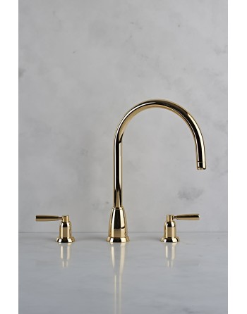Bateria kuchenna Perrin&Rowe model  Callisto ma piękną zakrzywioną wylewkę w kształcie litery C, uchwyty z dźwignią do dozowania gorącej i zimnej wody, a także poręczny boczny spray do płukania, który pomaga podczas gotowania, czyszczenia i napełniania garnków i patelni.